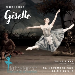 Am Sonntag, 26. November 2023, 14 bis 16 Uhr in unserem Studio in Duisburg-Walsum, Friedrich-Ebert-Straße 383, lernt ihr nach einem Warmup an der Stange die Variation der Giselle aus dem ersten Akt. Der Workshop bei der Waganowa-Absolventin Yulia Tikka ist geeignet für Mittelstufe/Fortgeschrittene.